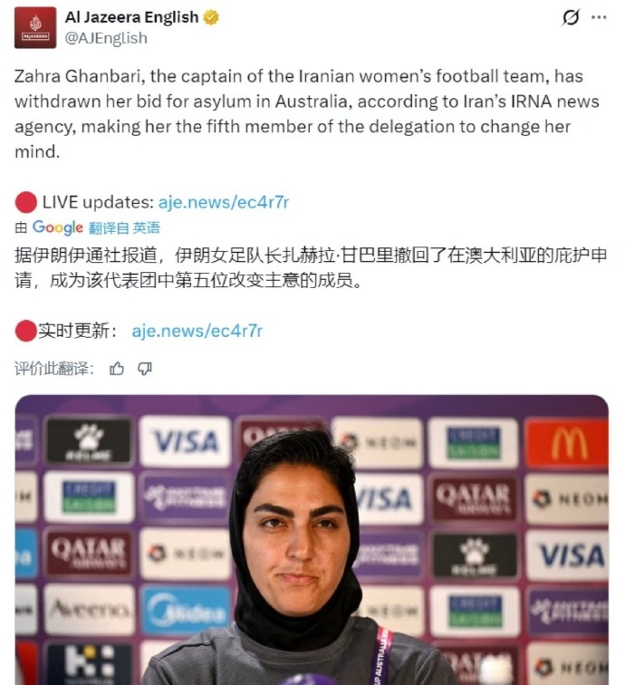 热门赛事直播-已有5人反悔 伊朗女足队长放弃庇护+深夜回国 外媒:她的家人失踪